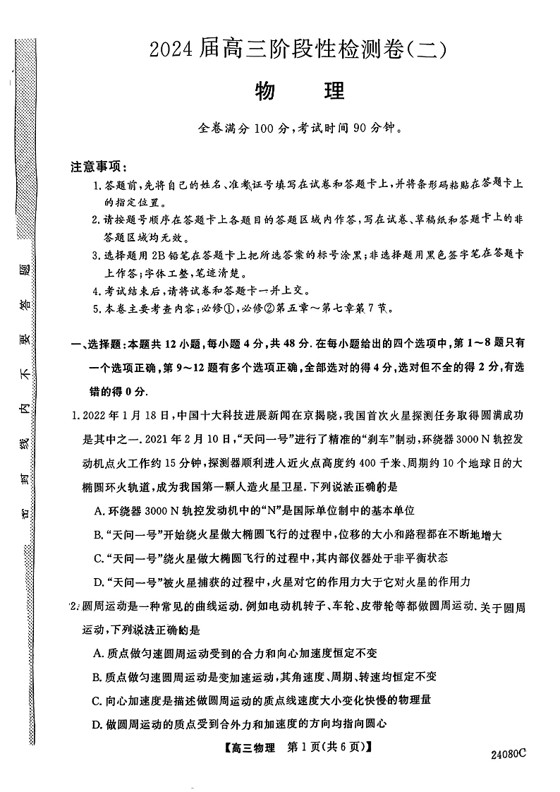 陕西省宝鸡教育联盟2024届高三上学期阶段性检测(二)物理