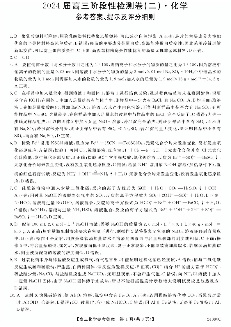 陕西省宝鸡教育联盟2024届高三上学期阶段性检测(二)化学答案