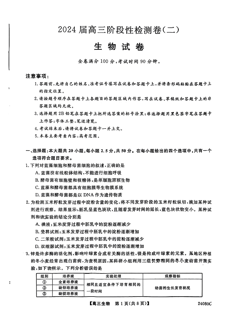 陕西省宝鸡教育联盟2024届高三上学期阶段性检测(二)生物