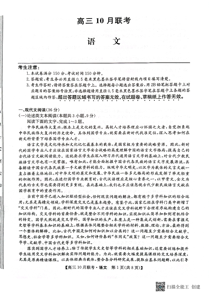 陕西省安康市重点名校2024届高三上学期10月联考语文