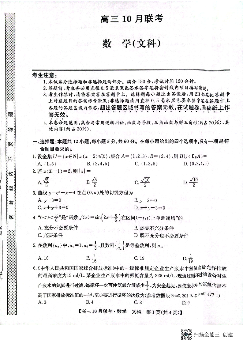 陕西省安康市重点名校2024届高三上学期10月联考数学(文科)