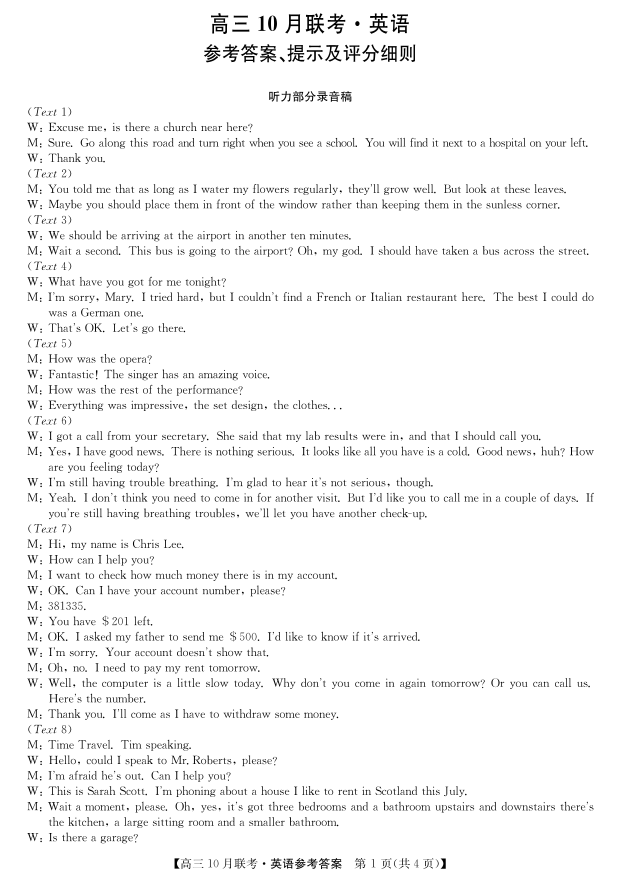 陕西省安康市重点名校2024届高三上学期10月联考英语答案含听力