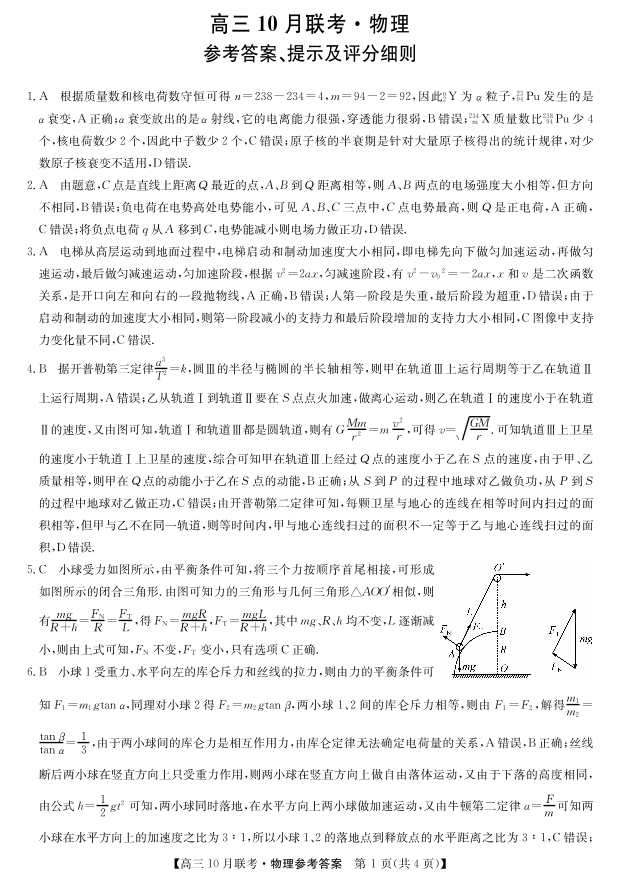 陕西省安康市重点名校2024届高三上学期10月联考物理答案