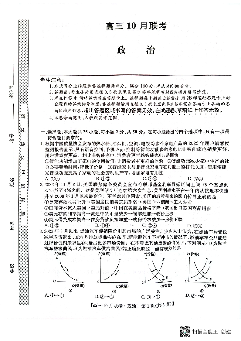 陕西省安康市重点名校2024届高三上学期10月联考政治