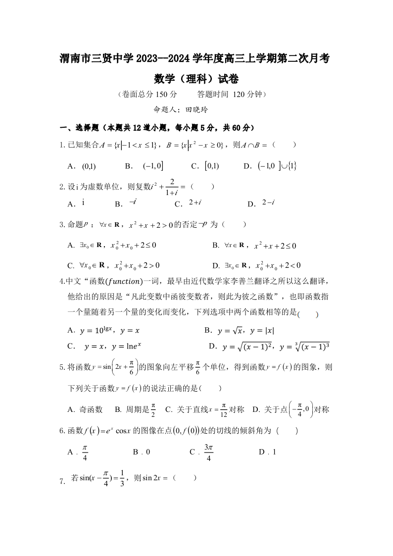 陕西省渭南市三贤中学2024届高三上学期10月月考理科数学
