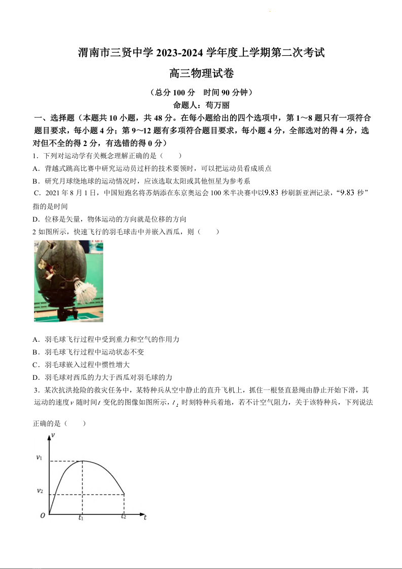 陕西省渭南市三贤中学2024届高三上学期10月月考物理