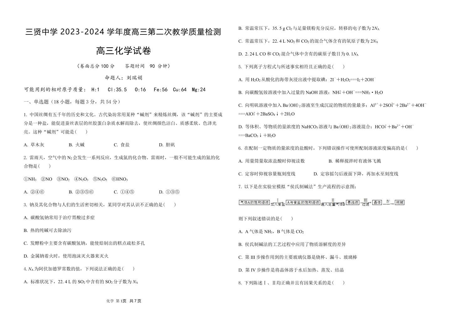 陕西省渭南市三贤中学2024届高三上学期10月月考化学