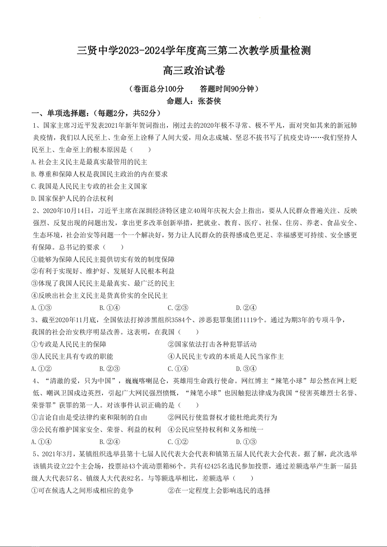 陕西省渭南市三贤中学2024届高三上学期10月月考政治