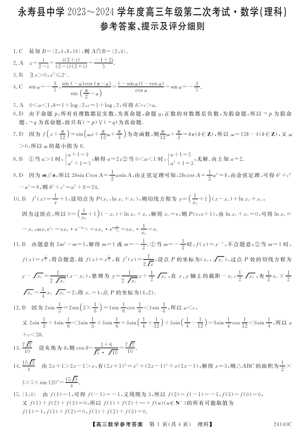 陕西省咸阳市永寿县中学2023-2024学年高三上学期第二次月考 理数答案