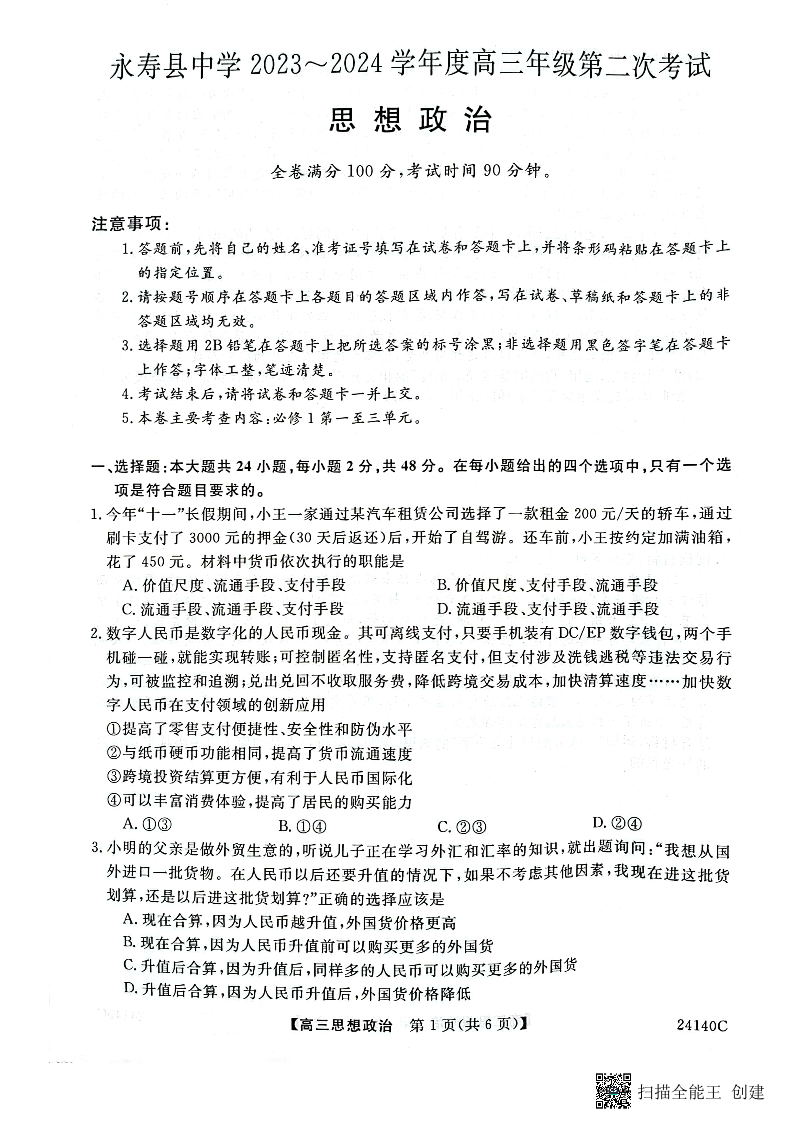 陕西省咸阳市永寿县中学2023-2024学年高三上学期第二次月考 政治