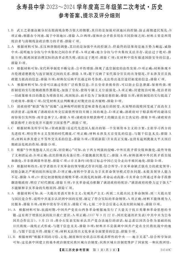 陕西省咸阳市永寿县中学2023-2024学年高三上学期第二次月考 历史答案