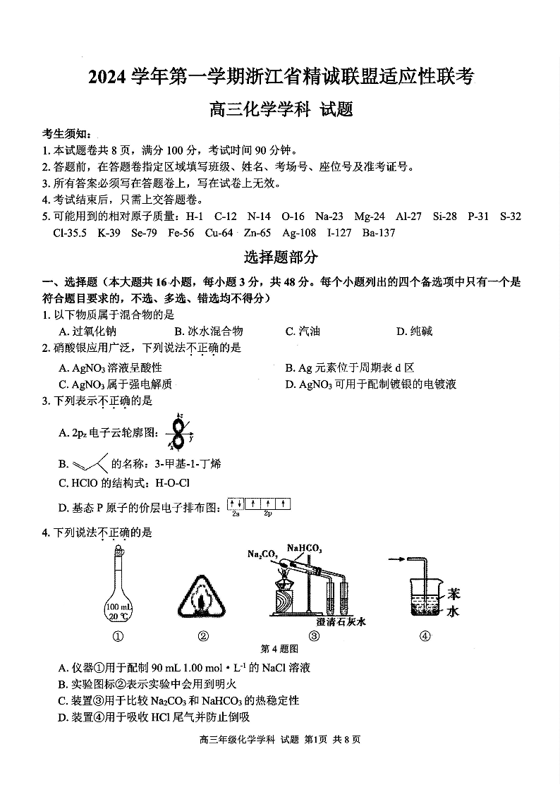 浙江省精诚联盟2025届高三上学期12月适应性联考化学