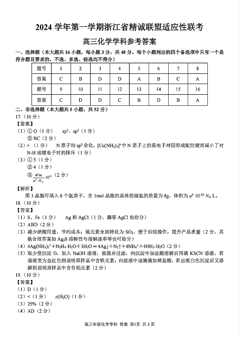 浙江省精诚联盟2025届高三上学期12月适应性联考化学答案