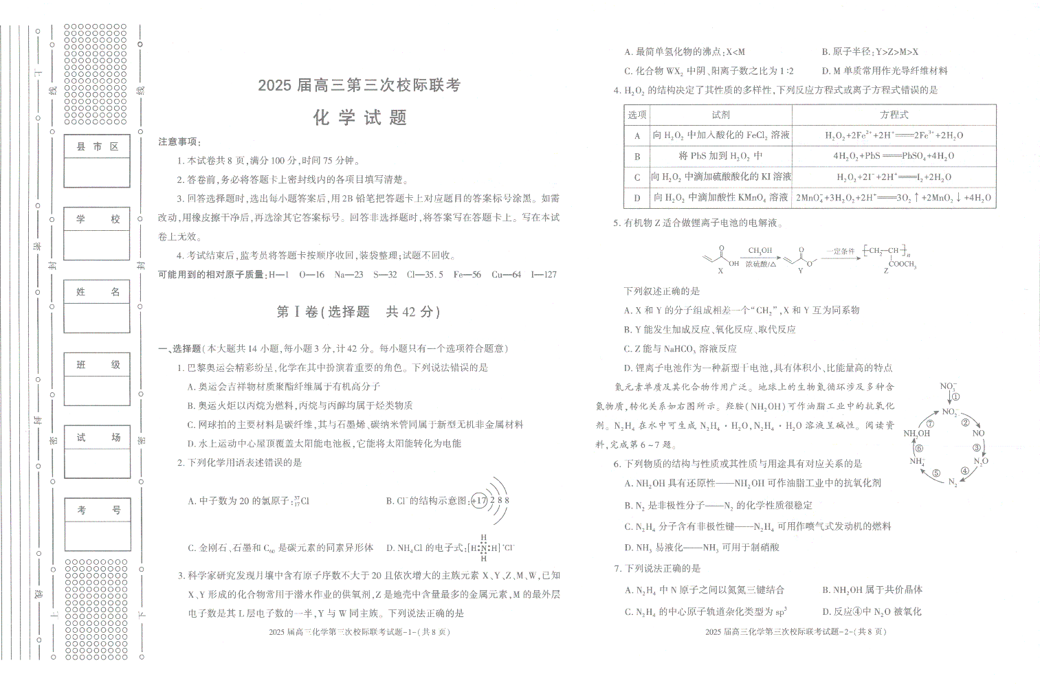 陕西省汉中市2025届高三上学期12月第三次校际联考化学+答案