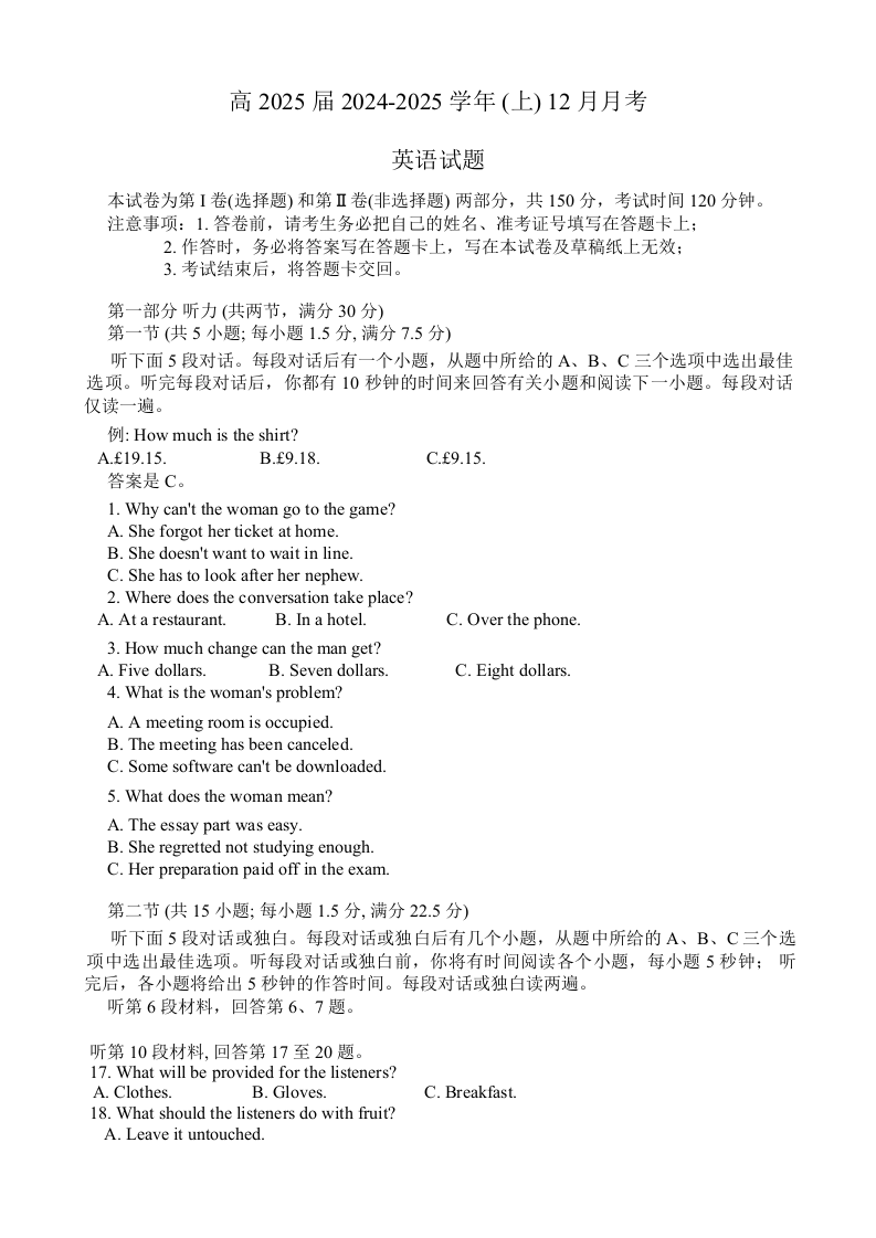 重庆市育才中学2025届高三上学期12月月考英语