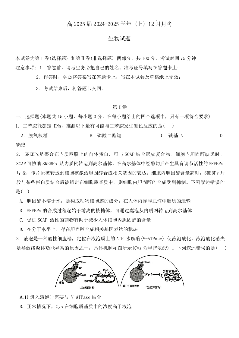 重庆市育才中学2025届高三上学期12月月考生物