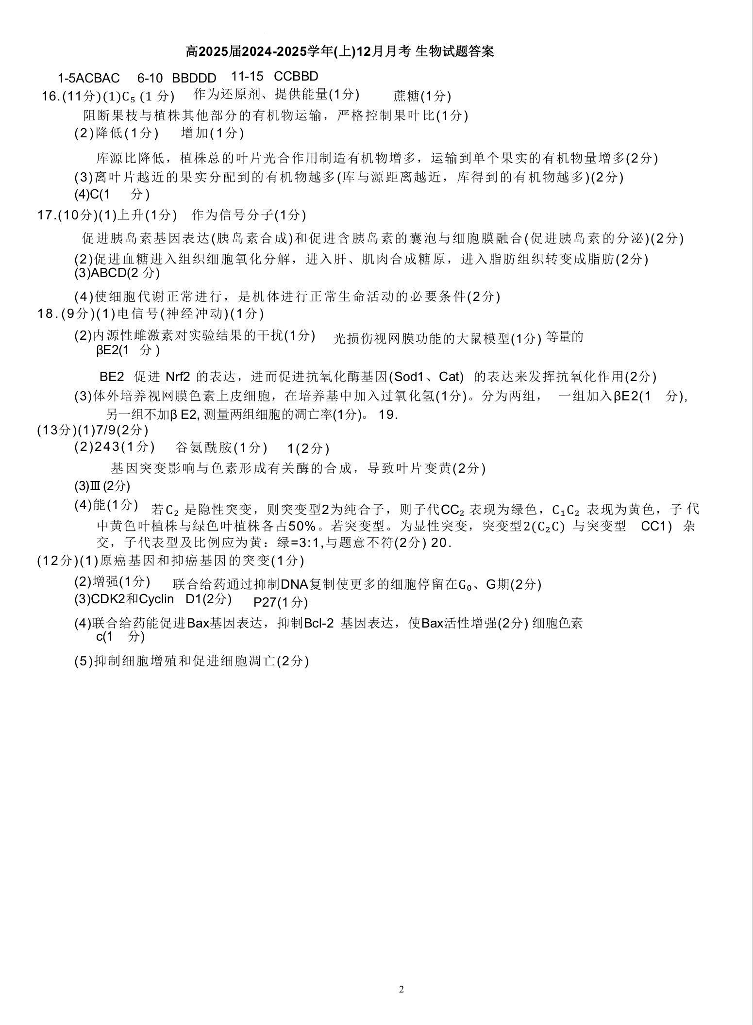 重庆市育才中学2025届高三上学期12月月考生物答案