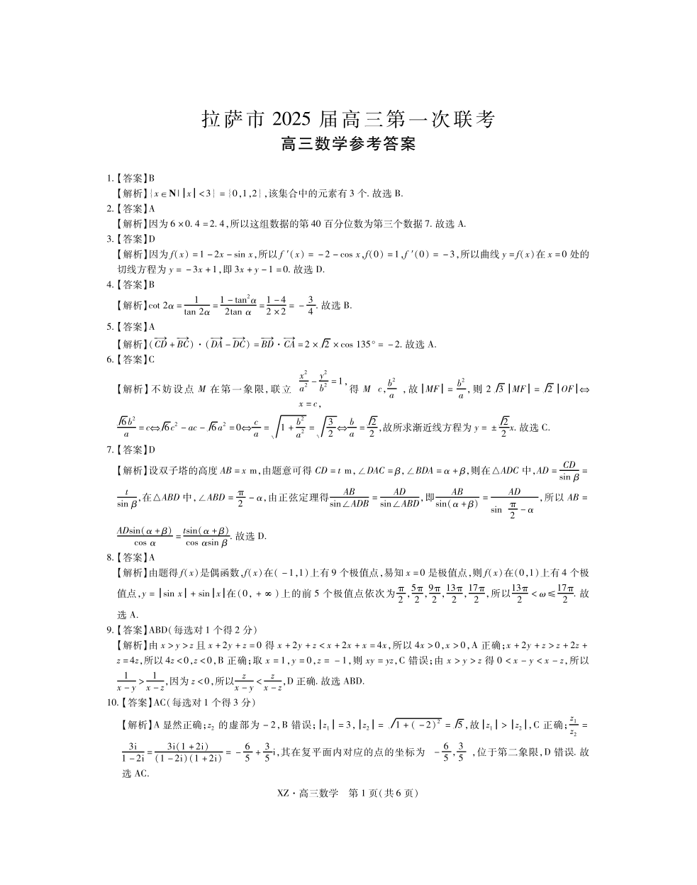 西藏自治区拉萨市2025届高三年级第一次联考数学答案