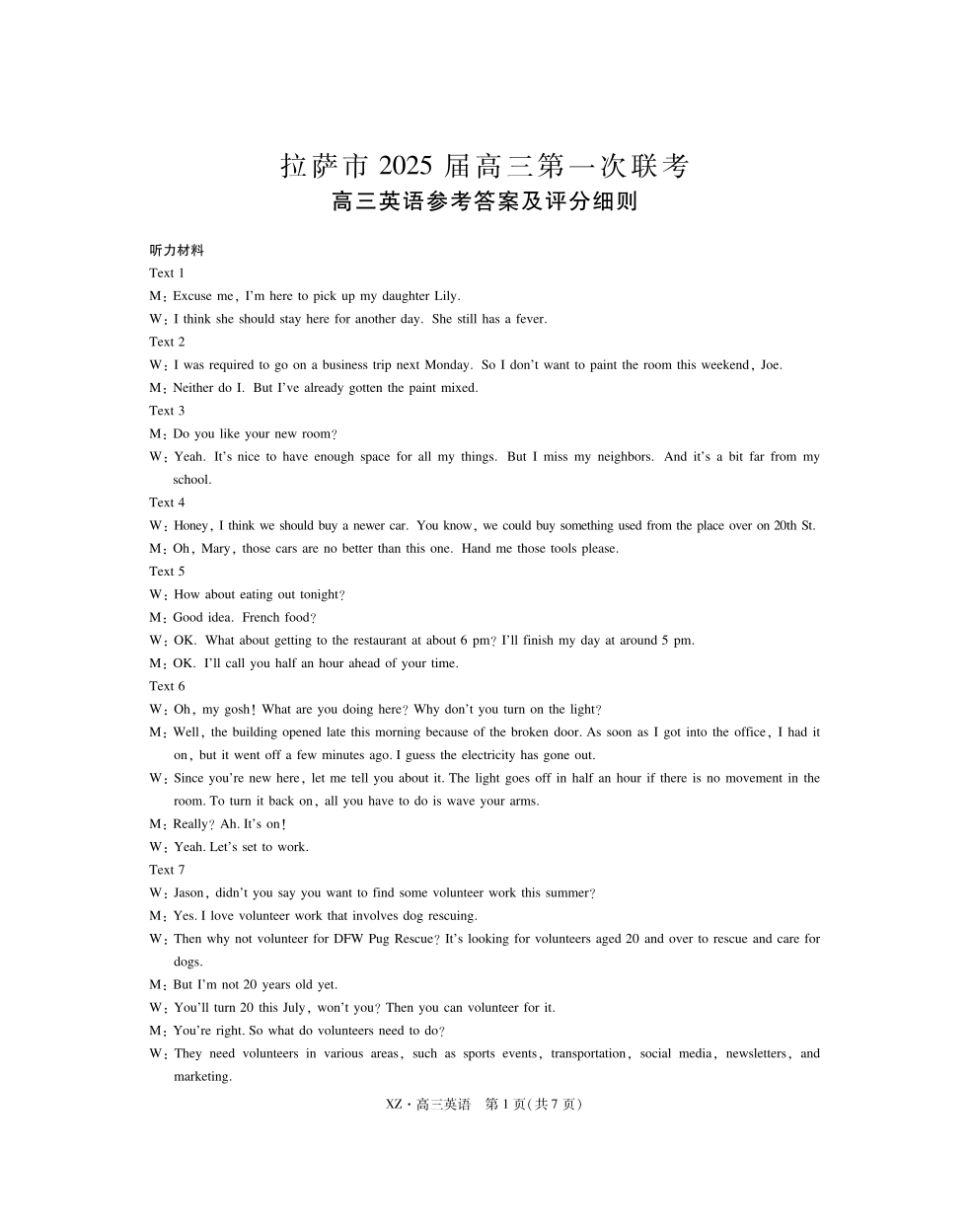 西藏自治区拉萨市2025届高三年级第一次联考英语答案