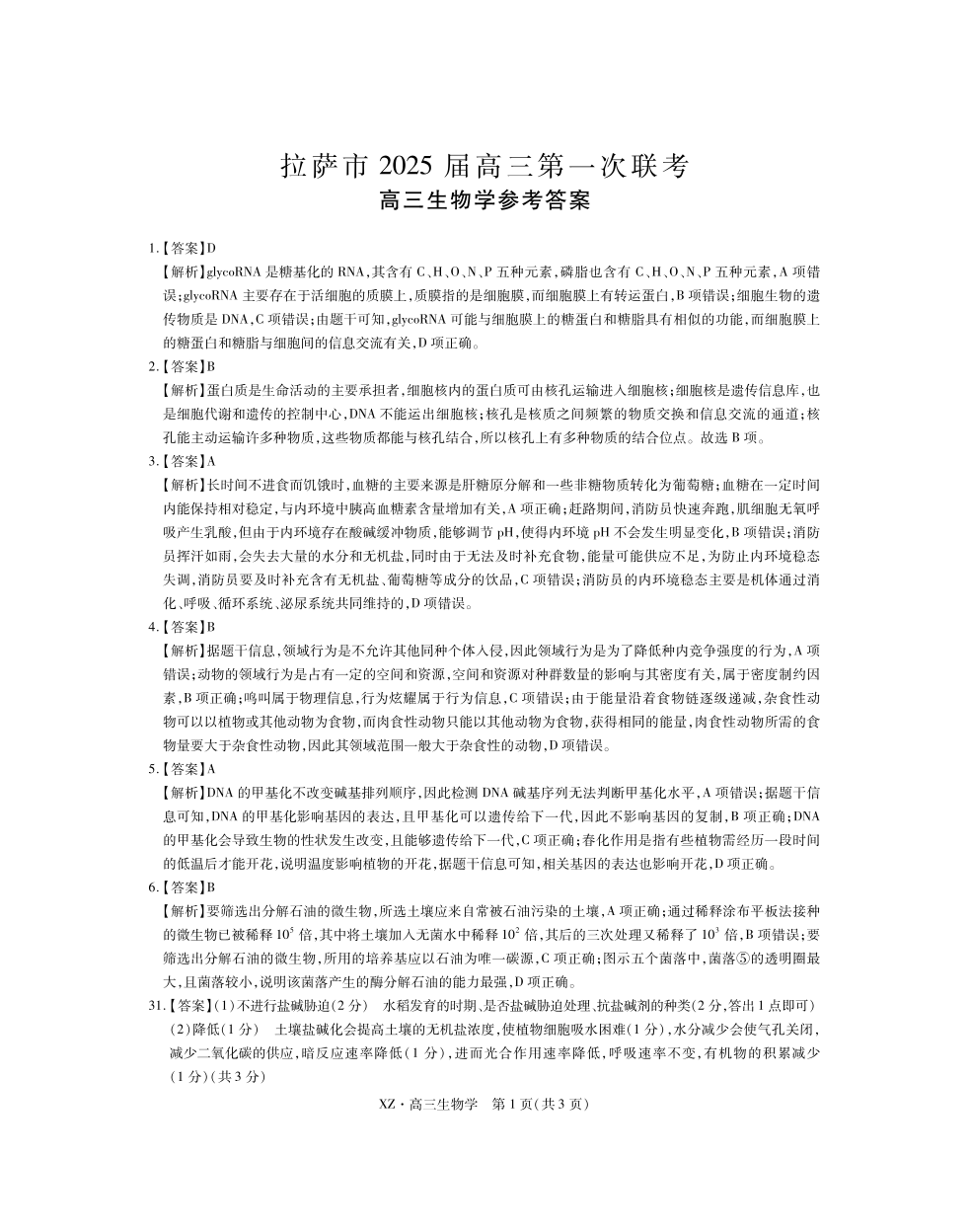 西藏自治区拉萨市2025届高三年级第一次联考生物答案