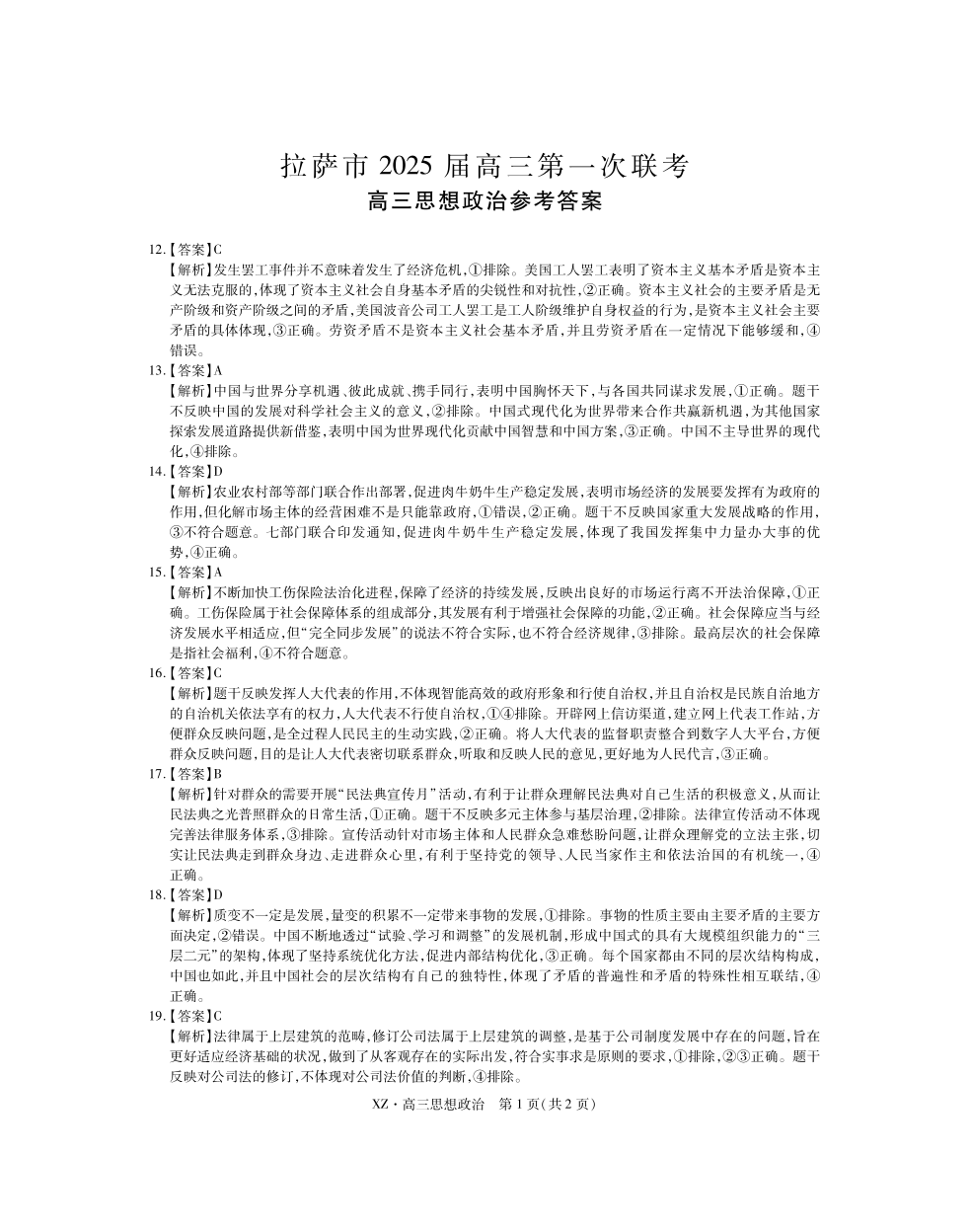 西藏自治区拉萨市2025届高三年级第一次联考政治答案