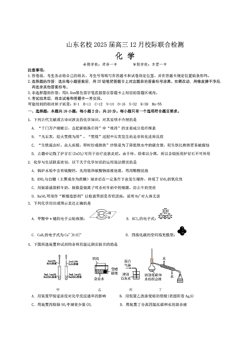 山东省区域名校2025届高三上学期12月校际联合检测化学+答案