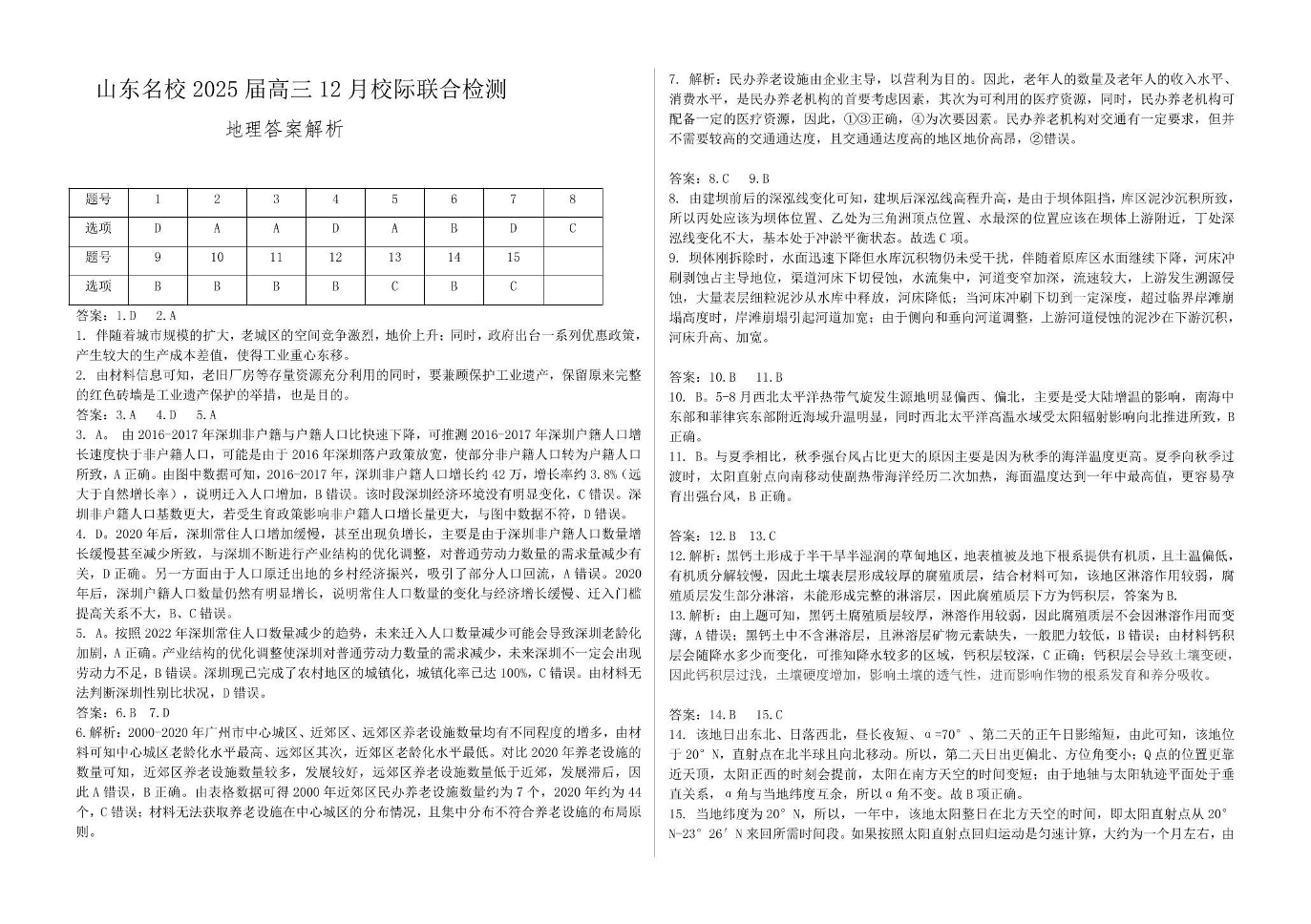 山东省区域名校2025届高三上学期12月校际联合检测地理答案