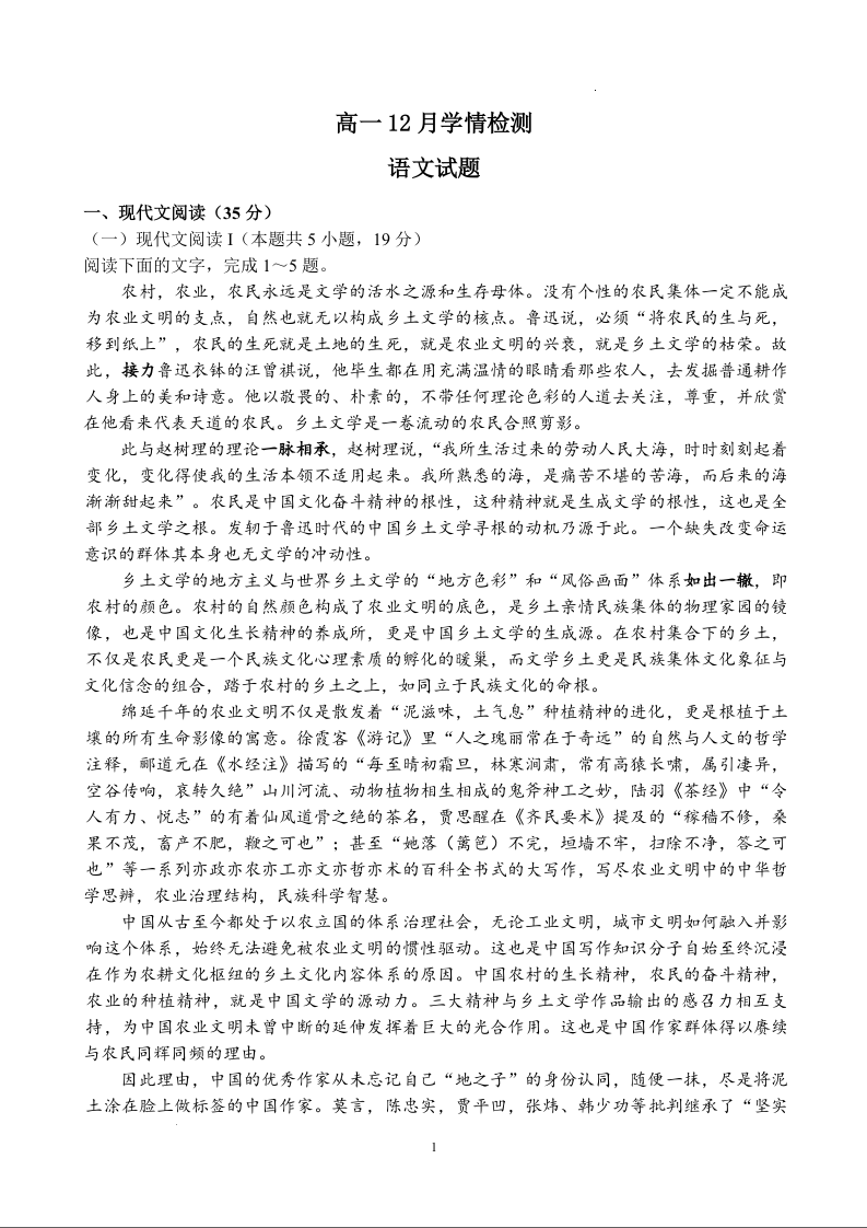江苏省扬州市八校2024-2025学年上学期12月高一学情检测语文
