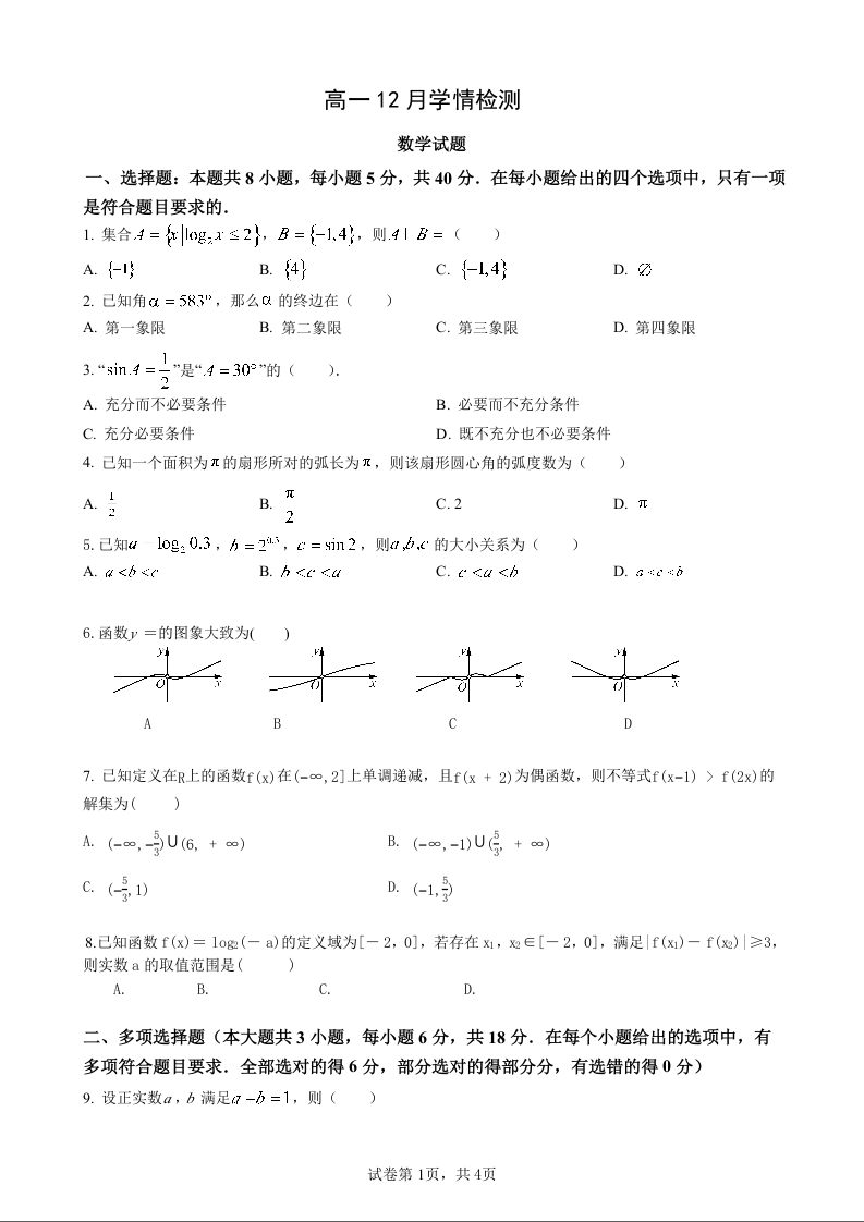 江苏省扬州市八校2024-2025学年上学期12月高一学情检测数学(原卷版)