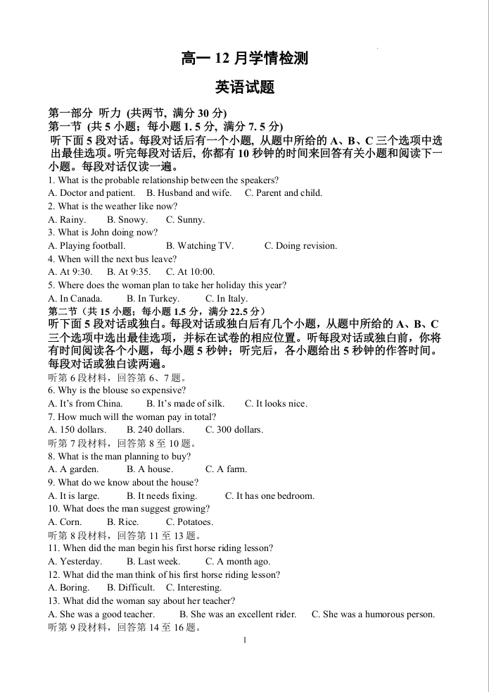江苏省扬州市八校2024-2025学年上学期12月高一学情检测英语