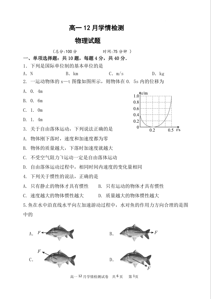 江苏省扬州市八校2024-2025学年上学期12月高一学情检测物理