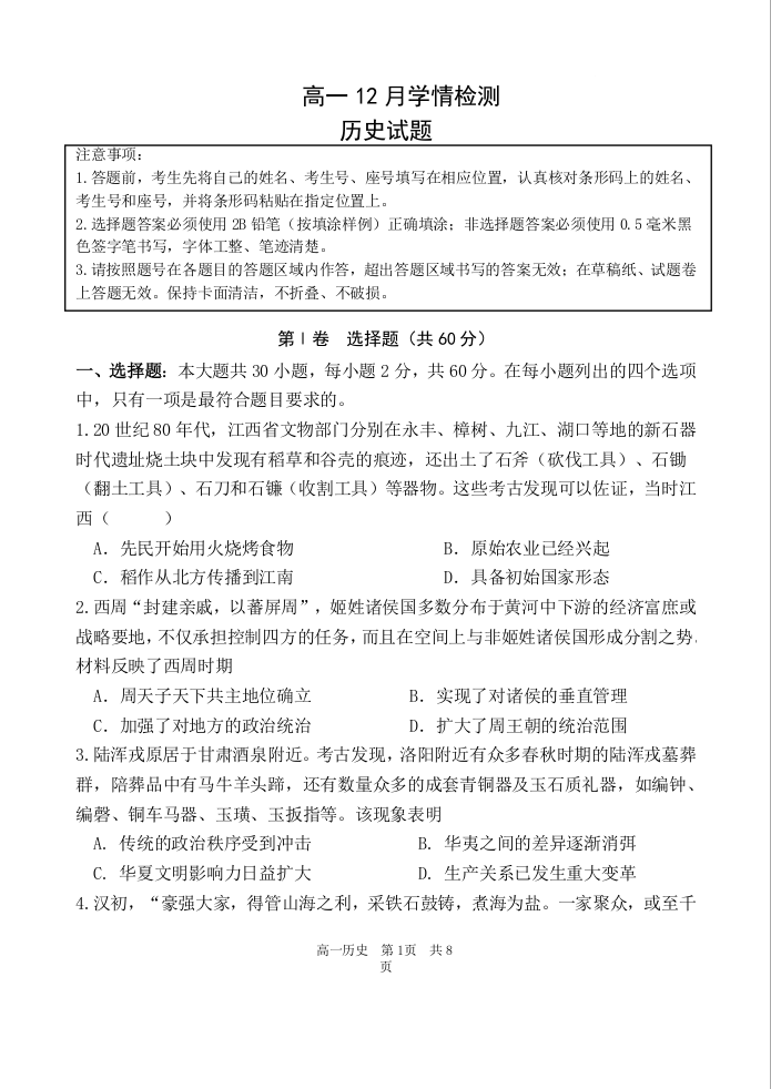 江苏省扬州市八校2024-2025学年上学期12月高一学情检测历史