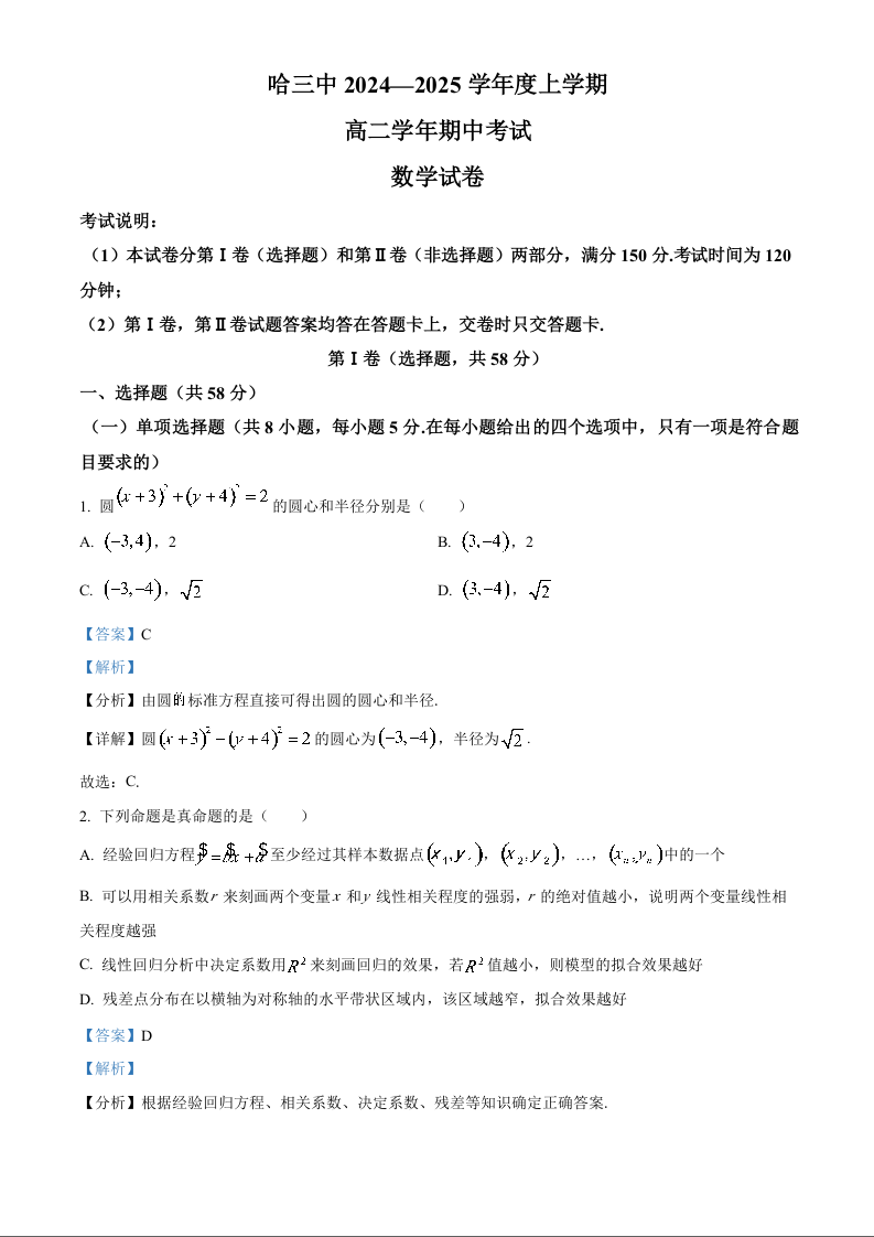 黑龙江省哈尔滨市第三中学2024-2025学年上学期高二期中考试数学(精品解析版)