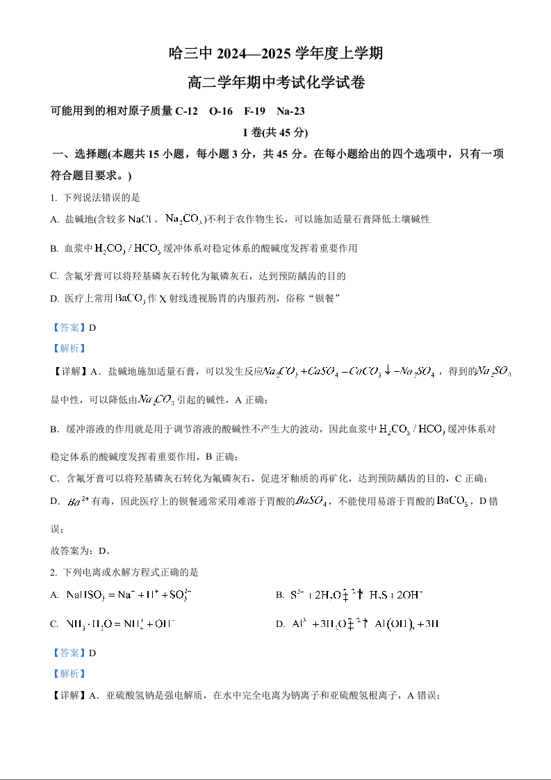 黑龙江省哈尔滨市第三中学2024-2025学年上学期高二期中考试化学(精品解析版)