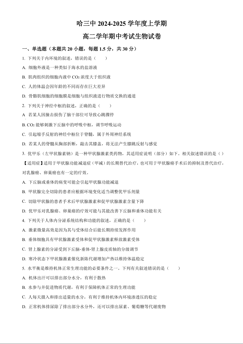黑龙江省哈尔滨市第三中学2024-2025学年上学期高二期中考试生物(原卷版)
