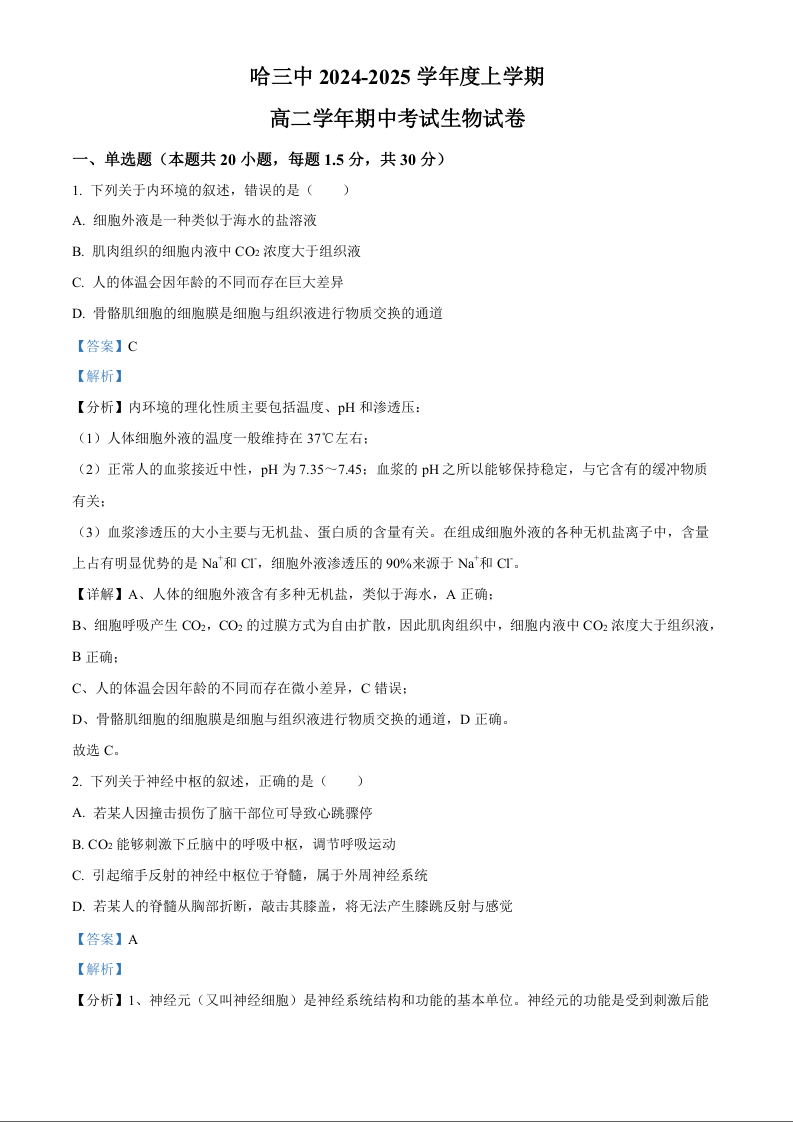 黑龙江省哈尔滨市第三中学2024-2025学年上学期高二期中考试生物(精品解析版)