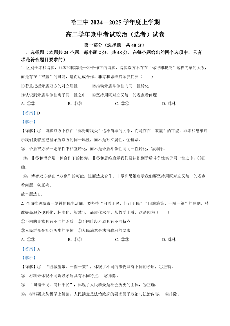 黑龙江省哈尔滨市第三中学2024-2025学年上学期高二期中考试政治(选考)(精品解析版)