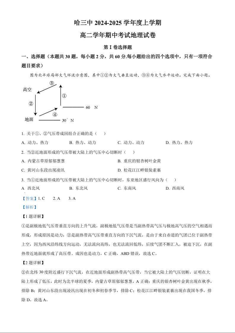 黑龙江省哈尔滨市第三中学2024-2025学年上学期高二期中考试地理(精品解析版)