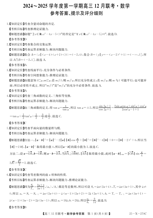 安徽省县中联盟2025届高三上学期12月联考数学答案