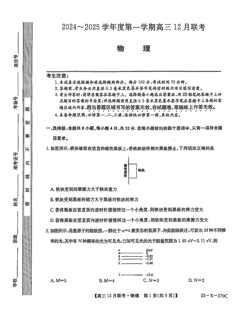 安徽省县中联盟2025届高三上学期12月联考物理+答案
