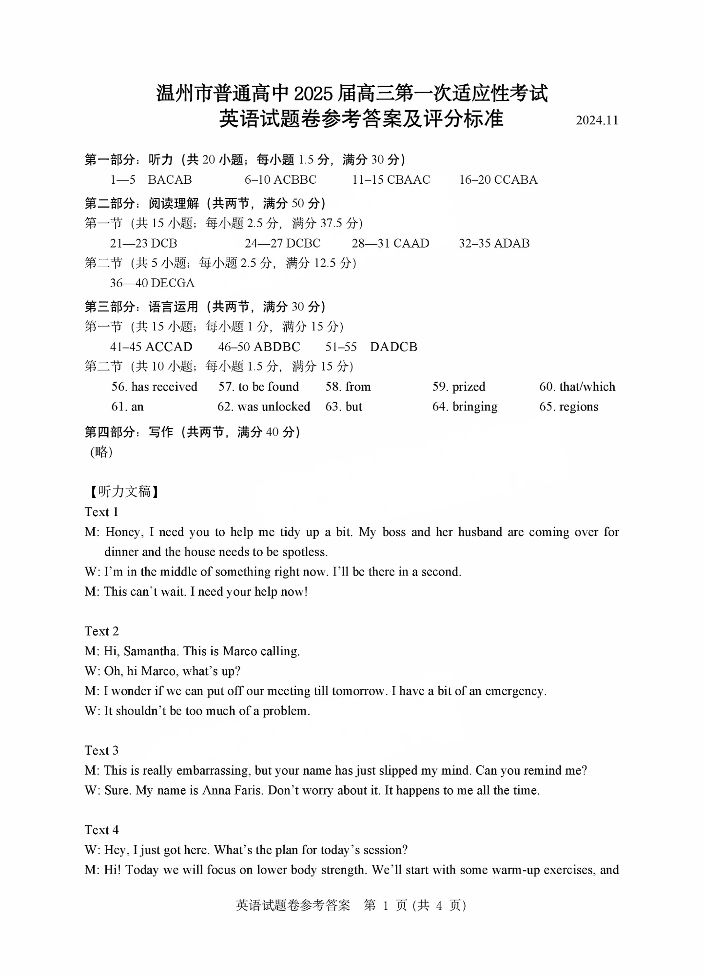 浙江省温州市高中2025届高三上学期第一次模拟考试英语答案