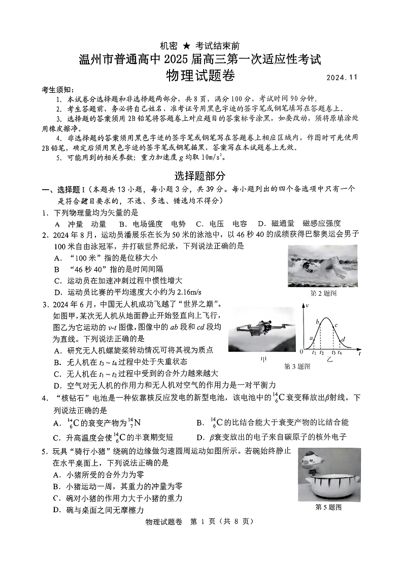 浙江省温州市高中2025届高三上学期第一次模拟考试物理