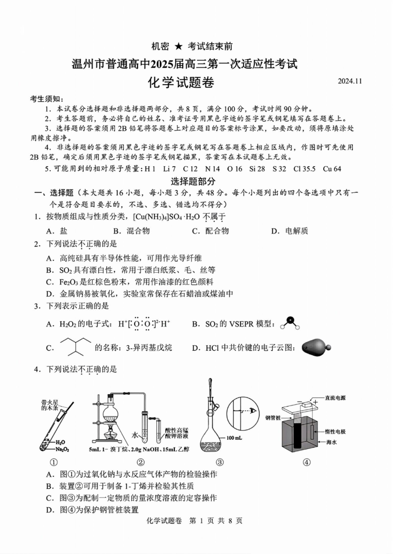 浙江省温州市高中2025届高三上学期第一次模拟考试化学