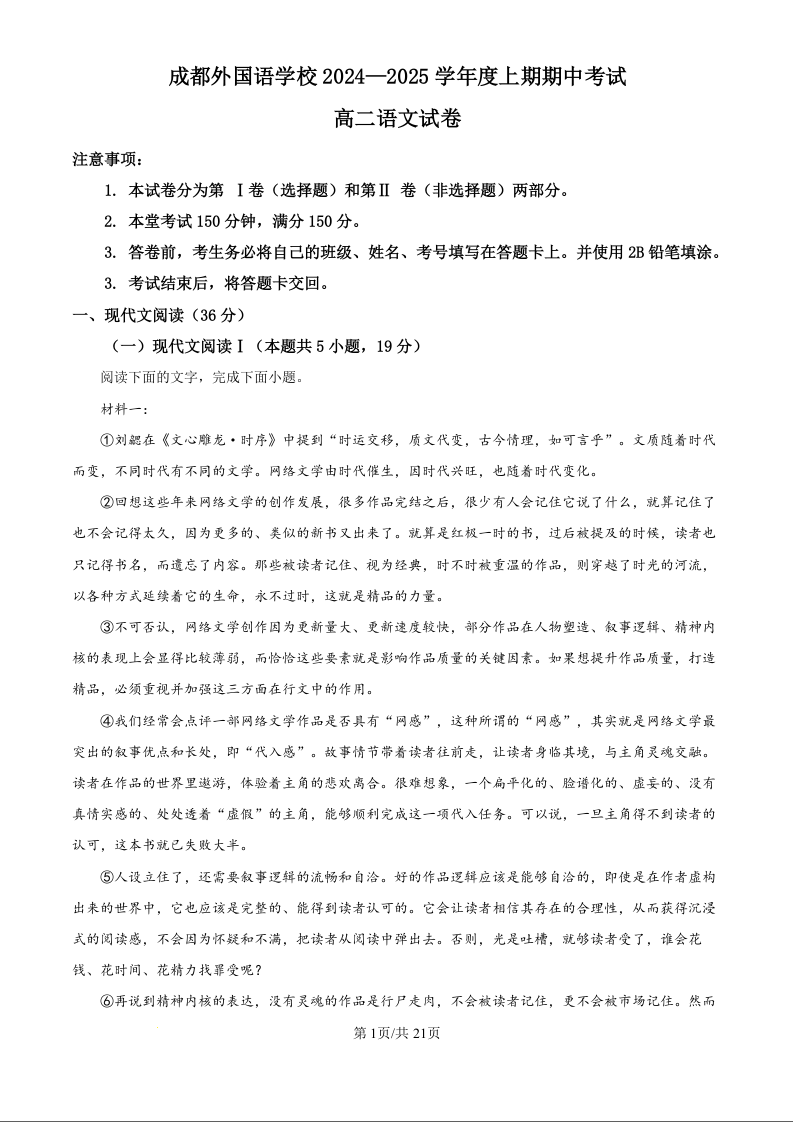 四川省成都外国语学校2024-2025学年高二上学期期中检测语文(精品解析版)