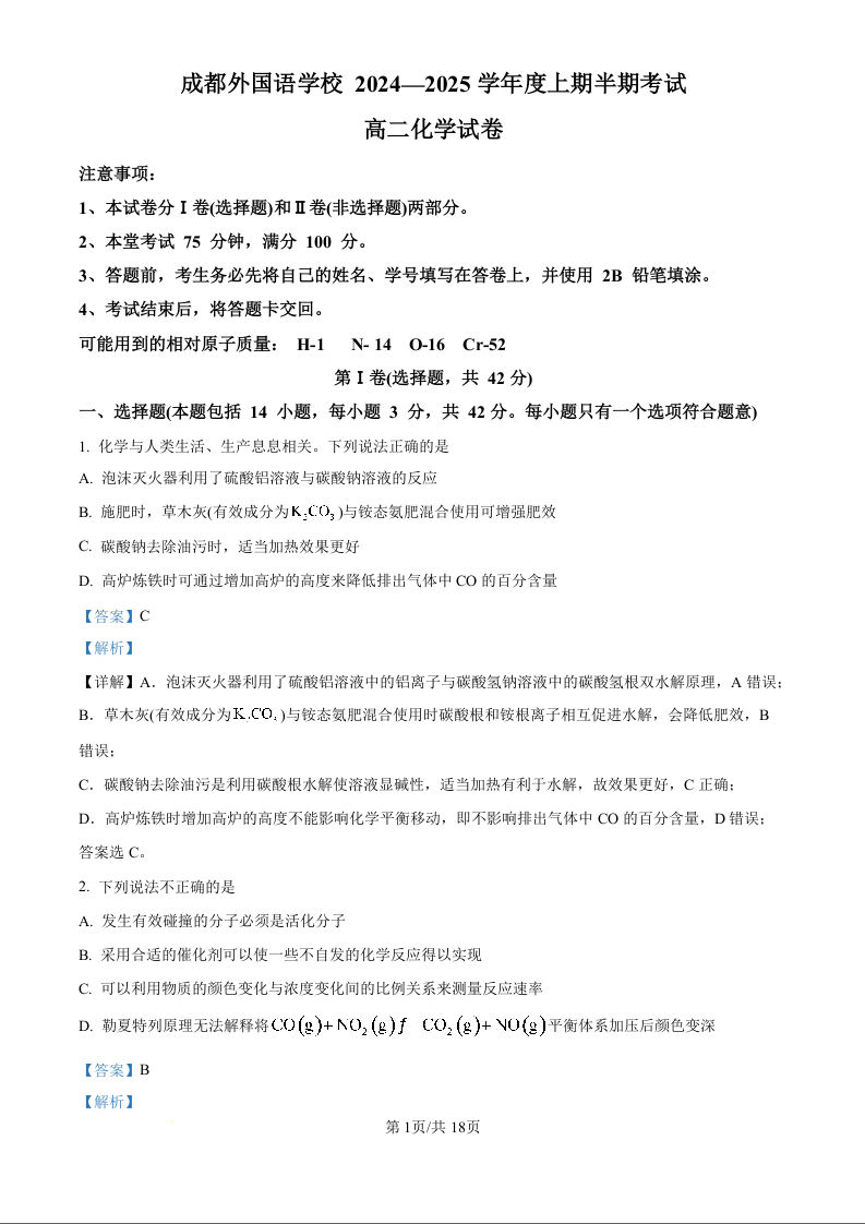四川省成都外国语学校2024-2025学年高二上学期期中检测化学(精品解析版)