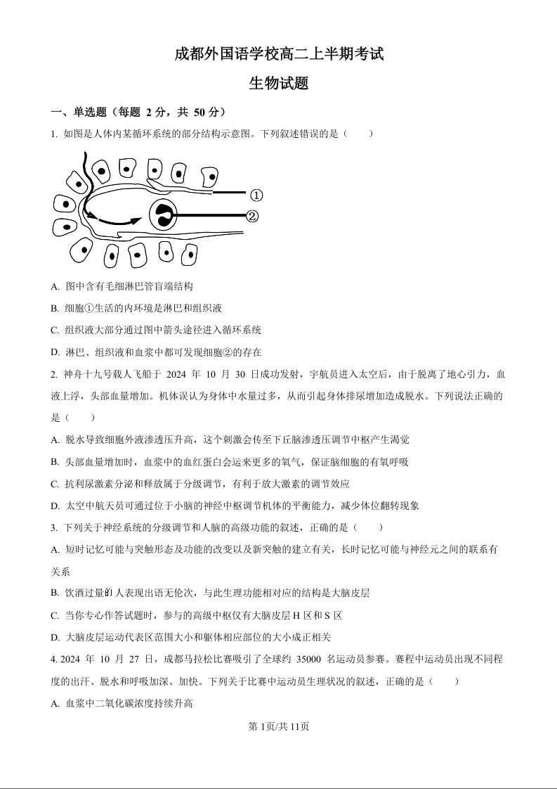 四川省成都外国语学校2024-2025学年高二上学期期中检测生物(原卷版)