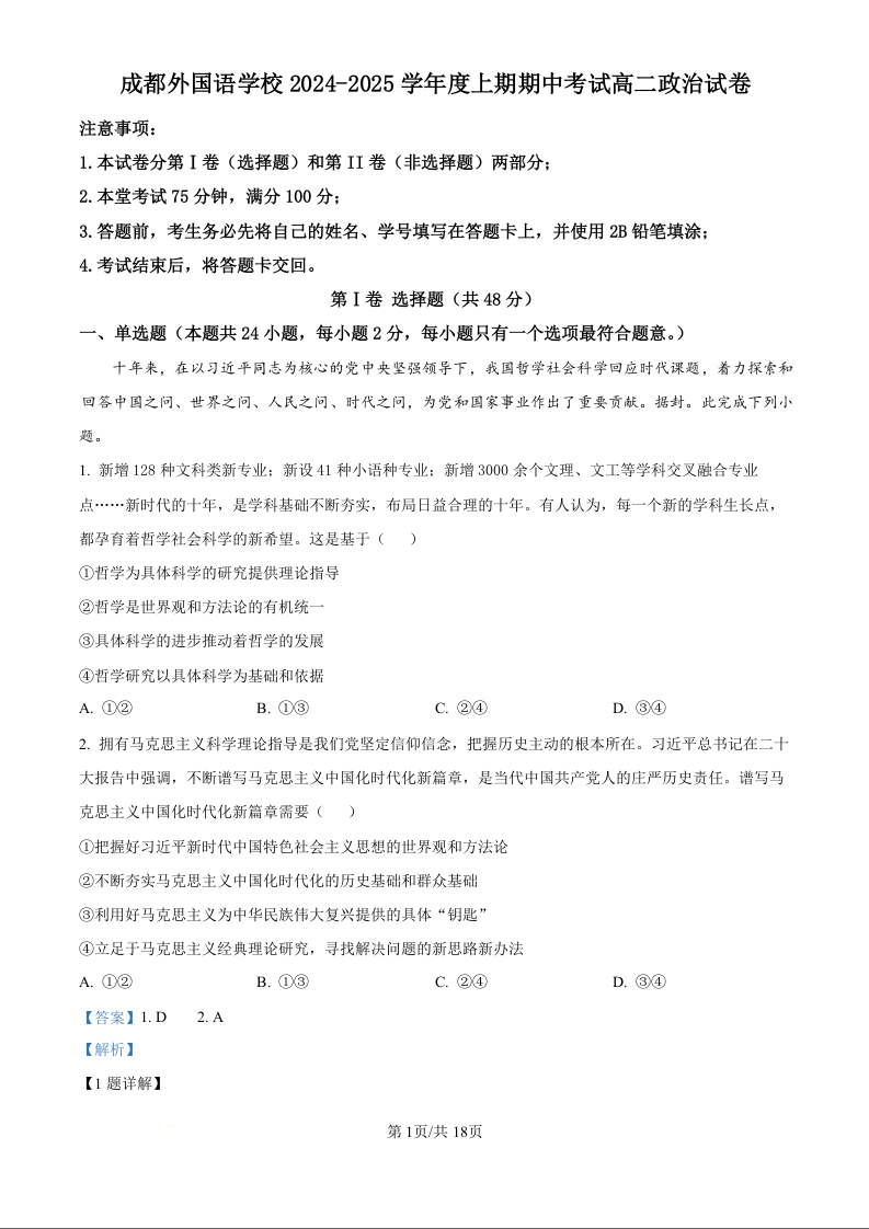 四川省成都外国语学校2024-2025学年高二上学期期中检测政治(精品解析版)