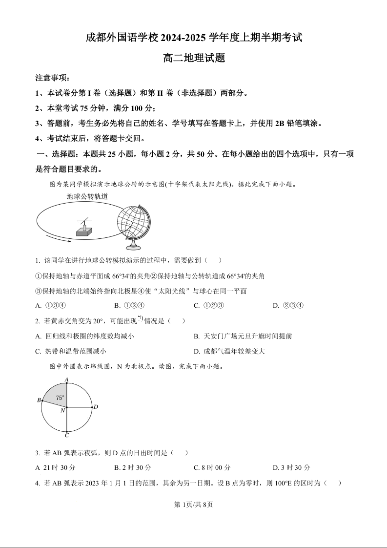 四川省成都外国语学校2024-2025学年高二上学期期中检测地理(原卷版)