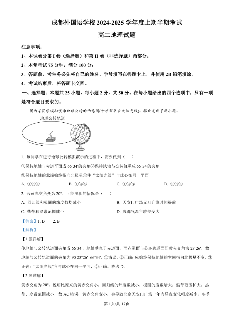 四川省成都外国语学校2024-2025学年高二上学期期中检测地理(精品解析版)