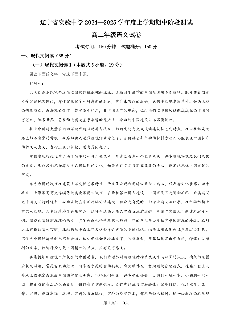 辽宁省实验中学2024-2025学年高二上学期期中考试语文(原卷版)